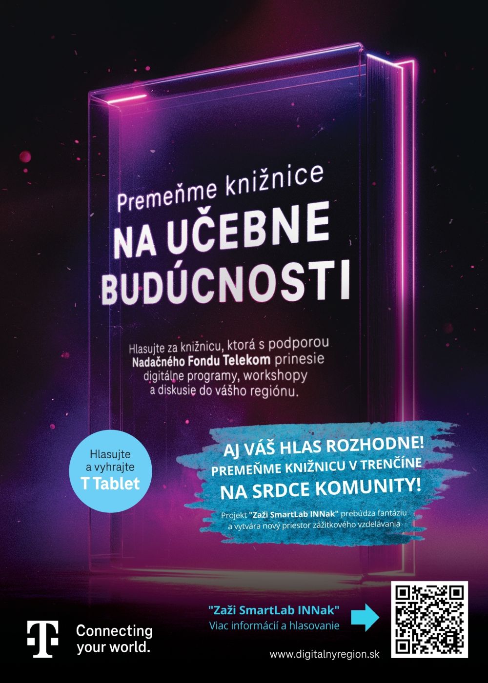 Vaším hlasom rozhodnete, či knižnica vo vašom meste získa grant. Zo všetkých zúčastnených bude vyžrebovaných 14 výhercov, v hlasujúcom každom kraji dvoch, ktorí získajú T Tablet.