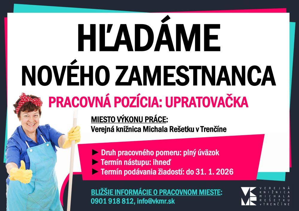 Verejná knižnica Michala Rešetku v Trenčíne ponúka obsadenie pracovného miesta "UPRATOVAČKA".