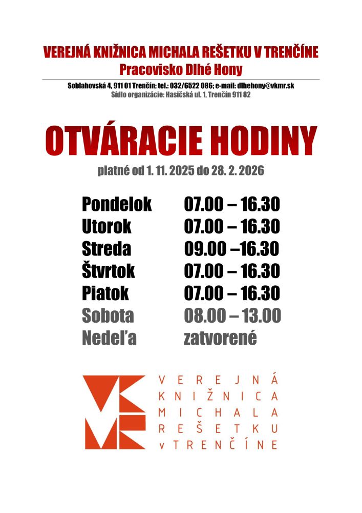 Vážení návštevníci, dovoľujeme si Vám oznámiť, že pracovisko Verejnej knižnice Michala Rešetku v Trenčíne na Dlhých Honoch bude mať od 1.11.2025 do 28.2.2026 upravenú otváraciu dobu.