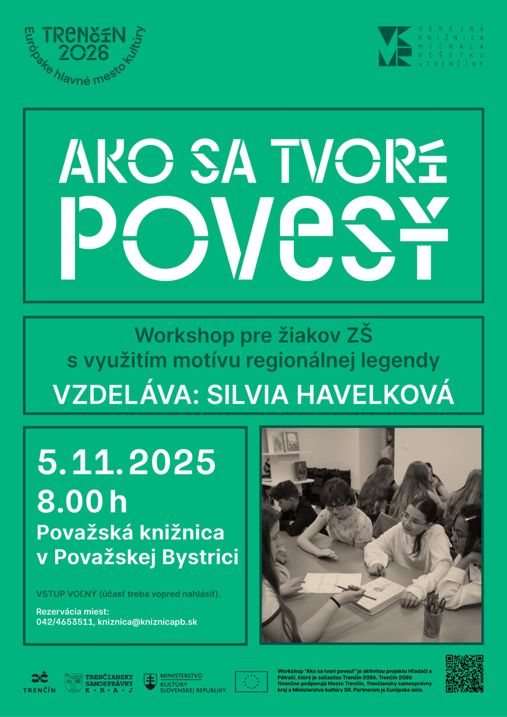 Workshop "Ako sa tvorí povesť" je aktivitou projektu Hľadači a pátrači, ktorý je súčasťou Trenčín 2026. Trenčín 2026 finančne podporujú Mesto Trenčín, Trenčiansky samosprávny kraj a Ministerstvo kultúry SR. Partnerom je Európska únia.