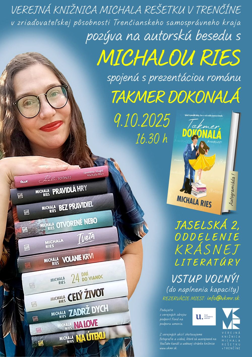 Beseda s regionálnou spisovateľkou, autorkou románov predovšetkým s romantickou tematikou, MICHALOU RIES, ktorá predstaví svoju najnovšiu knihu Takmer dokonalá.