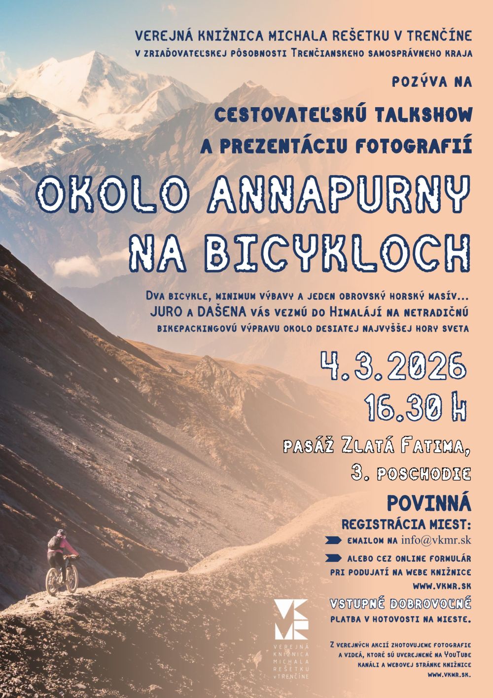 V cestovateľskej talkshow spojenej s prezentáciou fotografií vás JURO a DAŠENA vezmú do Himalájí na netradičnú bikepackingovú výpravu okolo Annapurny 8 091 m n. m – desiatej najvyššej hory sveta.