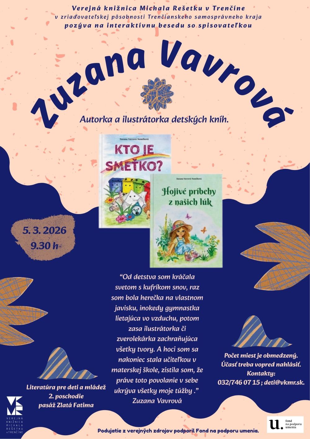 Stretnutie so spisovateľkou ZUZANOU VAVROVOU, ktorá interaktívne predstaví svoju tvorbu pre deti zameranú na formovanie porozumenia hodnotám prírody.
