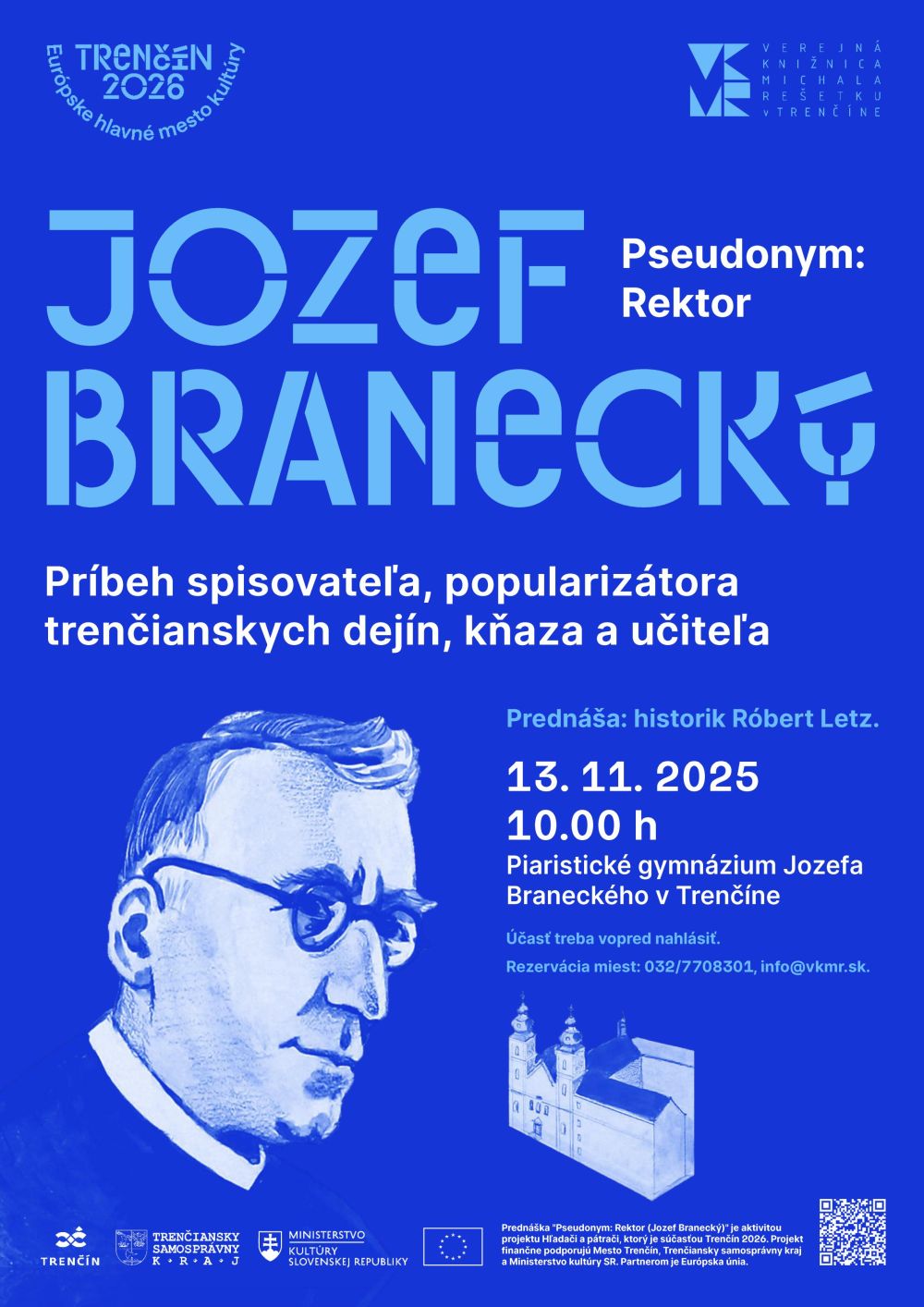 Prednáška "Pseudonym: Rektor (Jozef Branecký)" je aktivitou projektu Hľadači a pátrači, ktorý je súčasťou Trenčín 2026. Projekt finančne podporujú Mesto Trenčín, Trenčiansky samosprávny kraj a Ministerstvo kultúry SR. Partnerom je Európska únia.